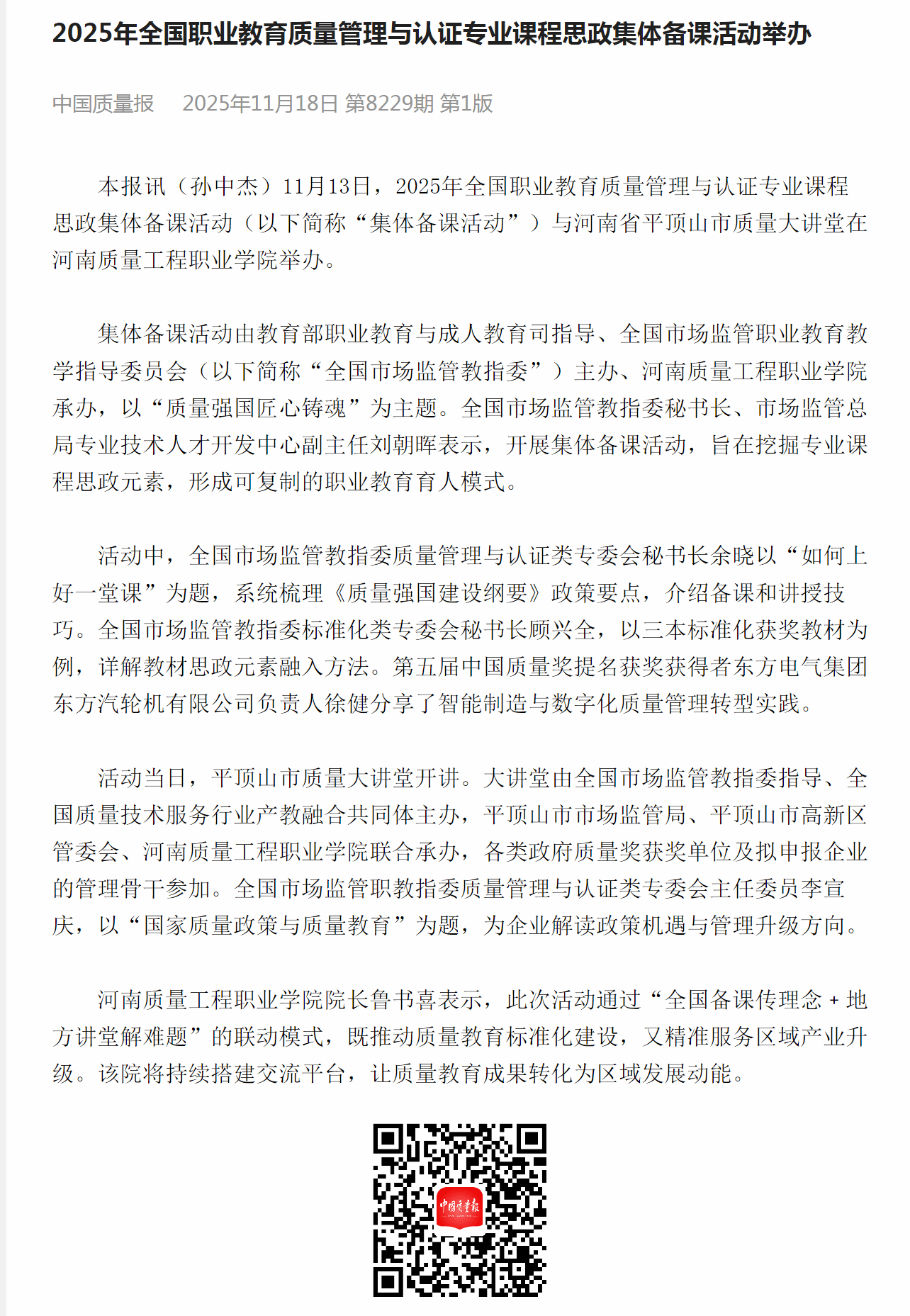 中国质量报:2025年全国职业教育质量管理与认证专业课程思政集体备课活动举办
