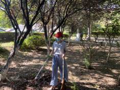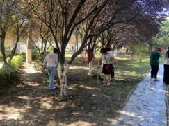 志愿者们拿这扫帚、夹子、铁锹等工具对实训楼前的树林绿化带中的烟头、白色垃圾、落枝落叶等进行清洁打扫。