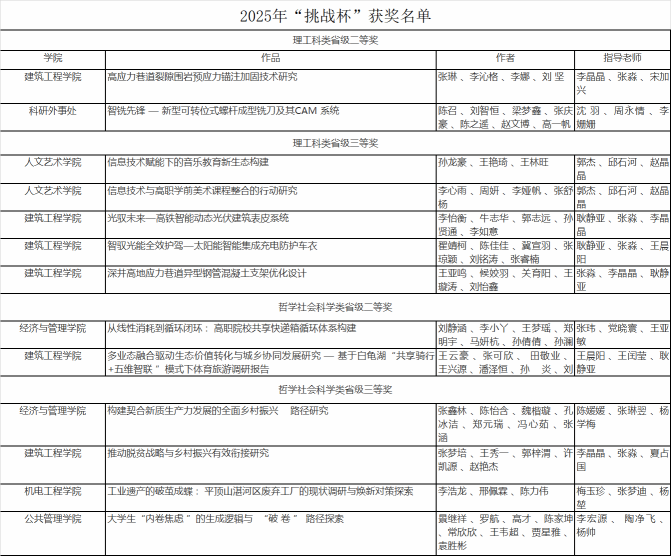 下一步,校团委将以此次竞赛为契机,认真总结经验,查找不足,持续完善学生科技创新支持体系,加强指导教师队伍建设,注重项目早期培育和持续孵化,着力提升项目核心竞争力,力争在未来的“挑战杯”及各类高水平学术科技竞赛中,实现高等级奖项和项目质量的新突破,为学校高质量发展注入更强的创新动能。