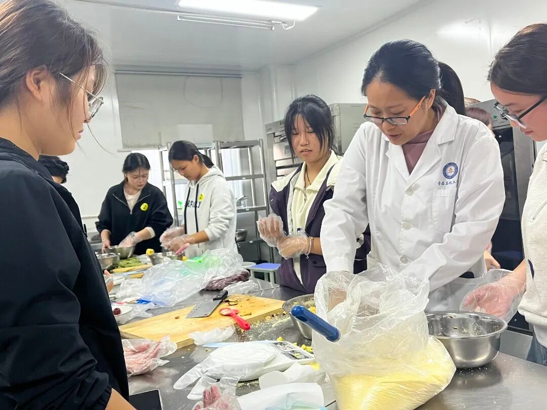 活动开始前,食品与化工学院李书华、张艳两位指导老师为同学们详细讲解了玉米面红枣窝窝头的原料配比、和面手法及蒸制注意事项。随后,同学们4—5人为一组,分工合作,有序进行温水调配、红枣去核、面团揉制等步骤。大家积极参与,默契配合,现场气氛轻松活跃
