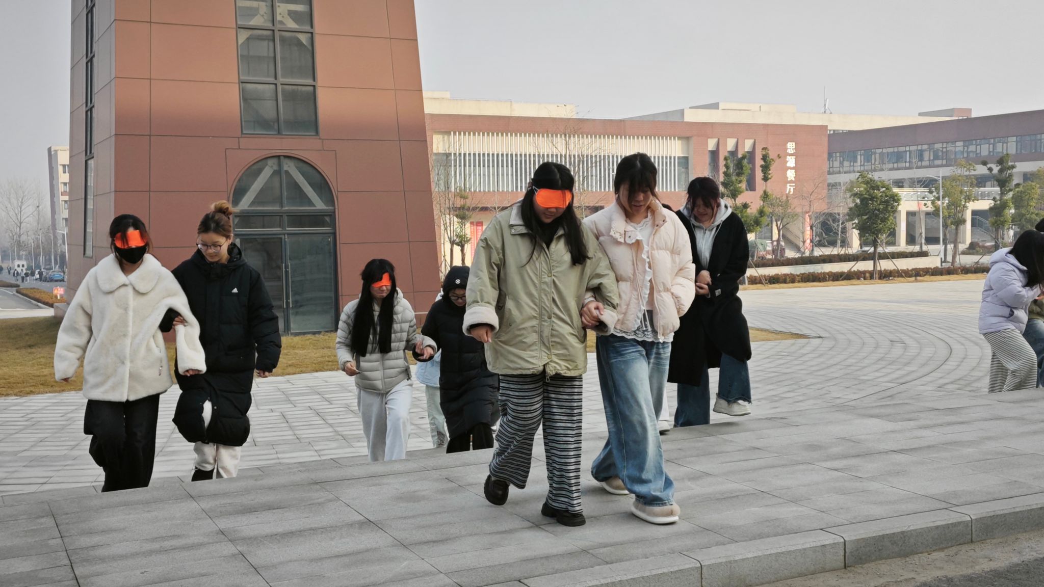 盲人戴上眼罩,在拐杖的纯肢体引导下,小心翼翼地跨越障碍、上下楼梯,完全将自己的安全托付给同伴。拐杖则需全神贯注,用搀扶、轻拍、指引等方式,为同伴开辟一条安全的道路。没有语言交流,只有心与心的贴近和无言的默契。一轮结束后,双方互换角色,让每一位学生都能深刻体会到作为被帮助者的依赖与感激,以及作为帮助者的责任与担当。