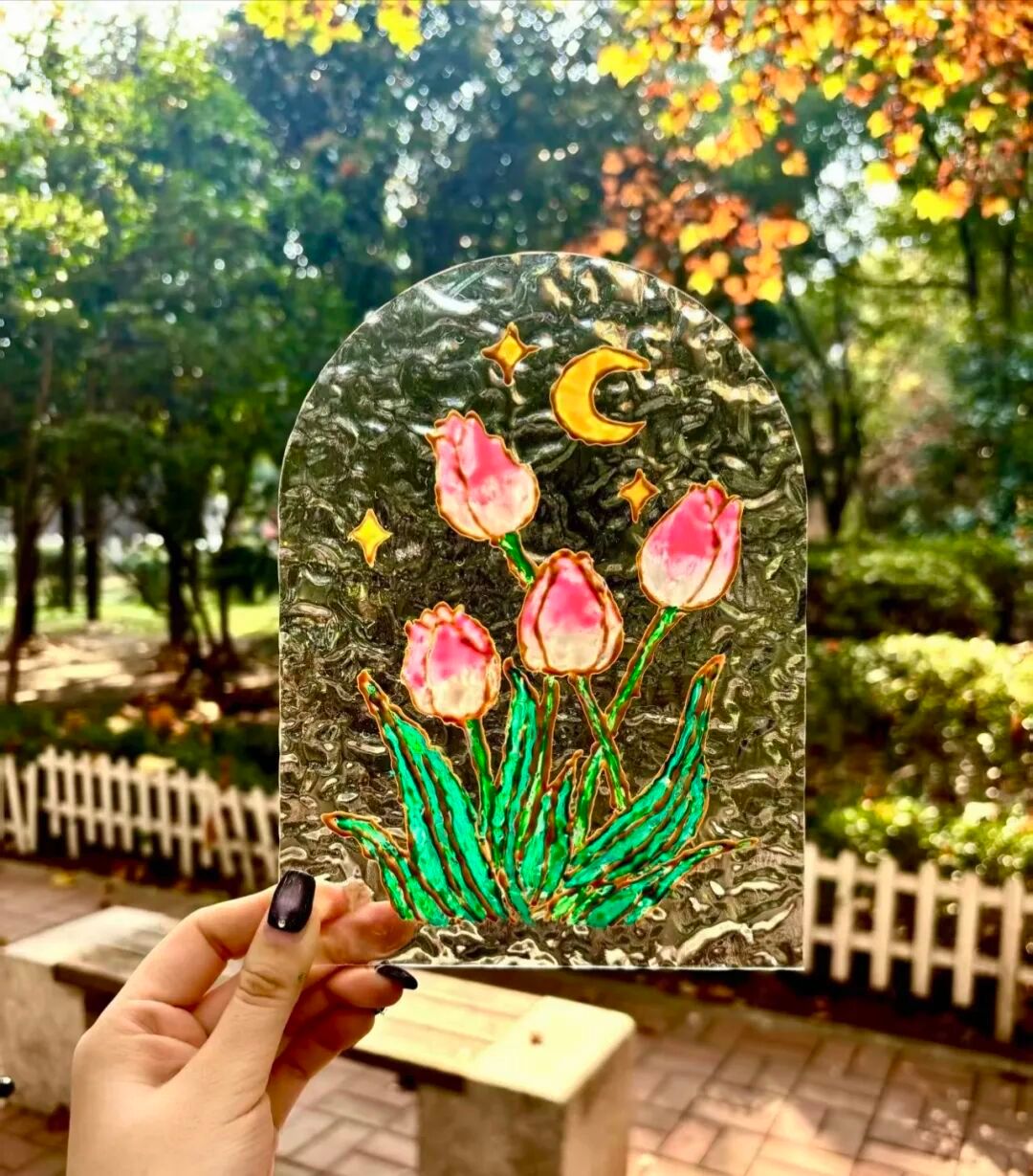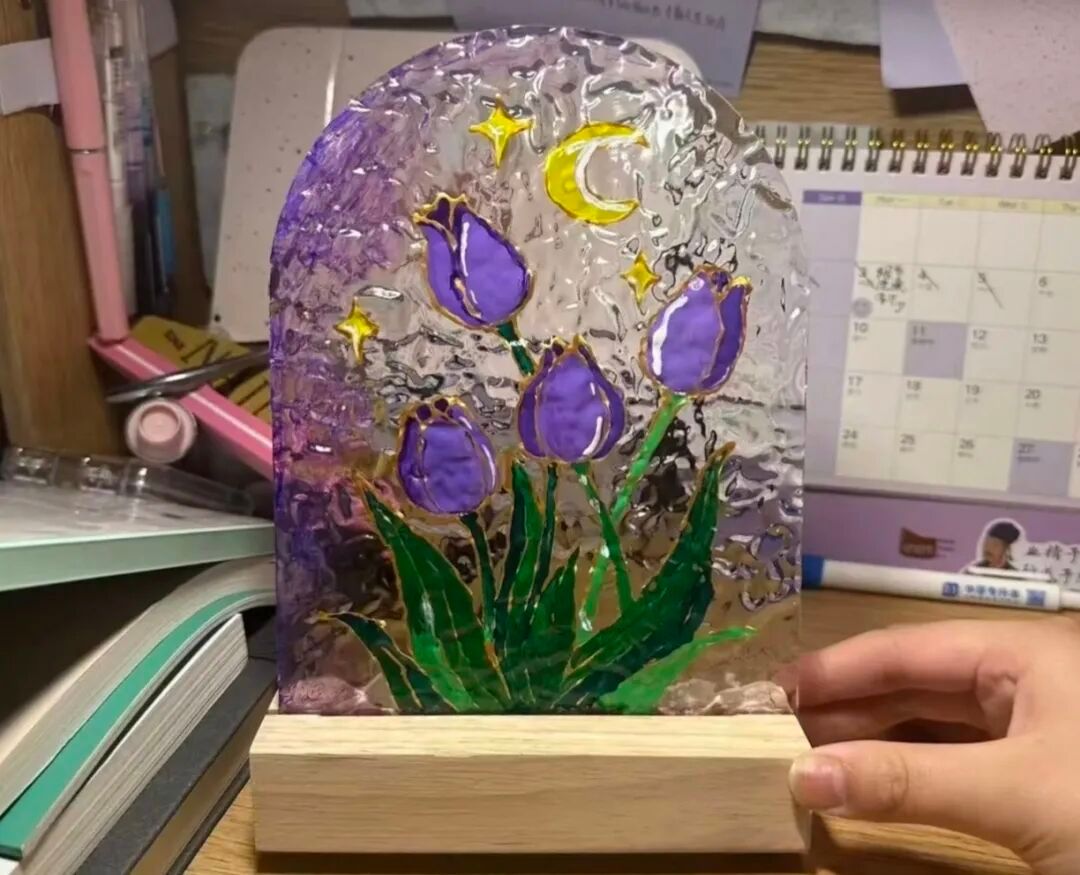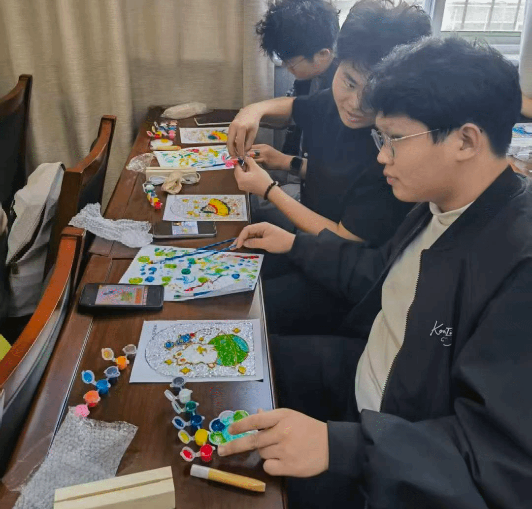 活动伊始,在老师的引导下,同学们先拿起勾线笔在玻璃画板上勾勒轮廓,随后手持调色板调配色彩,将明亮的黄、温柔的粉、静谧的蓝等颜料细心填涂,让原本透明的玻璃画板逐渐焕发生机。