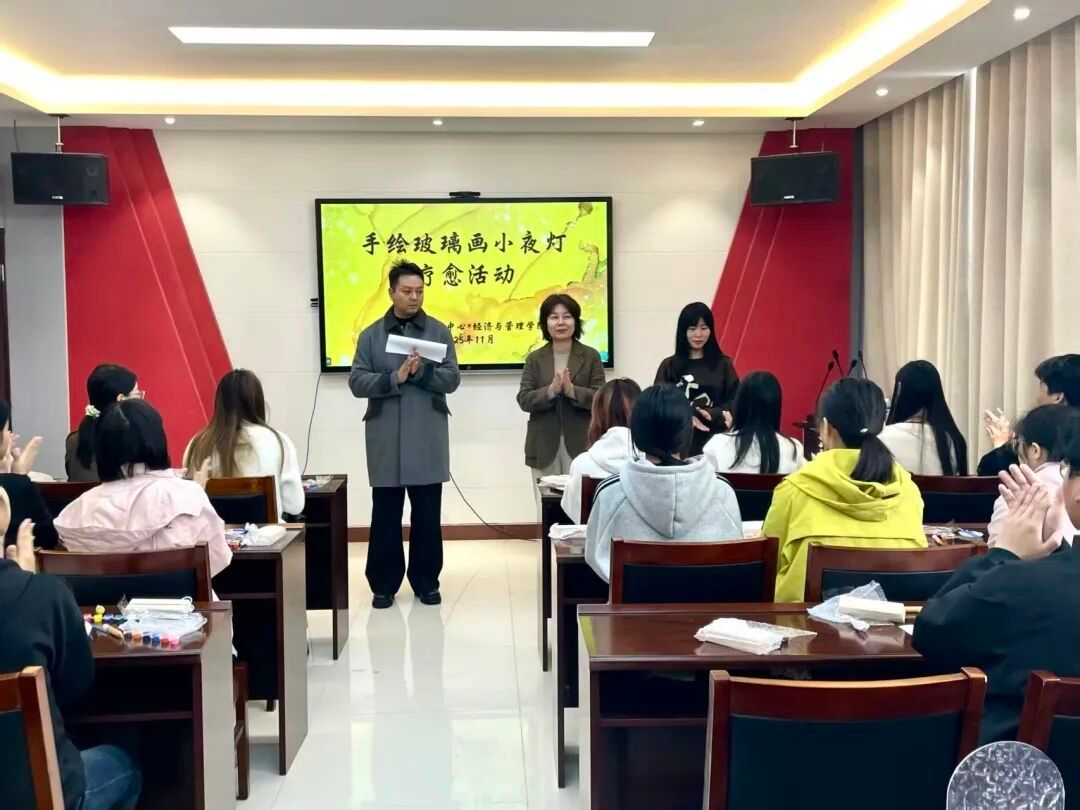 笔绘心光,灯暖心灵。在学校“2025年大学生心理健康教育宣传月”系列活动持续推进之际,经济与管理学院于11月5日举办了“点亮心灯・绘色心情”手绘玻璃画小夜灯疗愈活动,经济与管理学院党总支书记党晓寰、副书记王琳琳、心理专员张孟琳与35名学生共同参与,在色彩与光影的交融中开启心灵疗愈之旅。