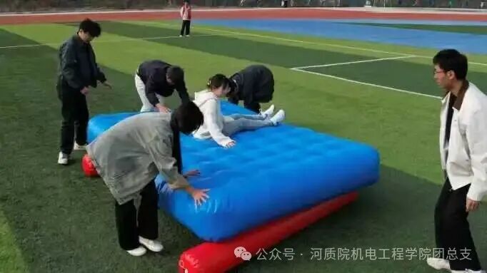 活动尚未开始,操场便已聚集了众多跃跃欲试的同学。当蓝色充气“坦克”与红色充气道具亮相时,现场氛围瞬间被点燃。