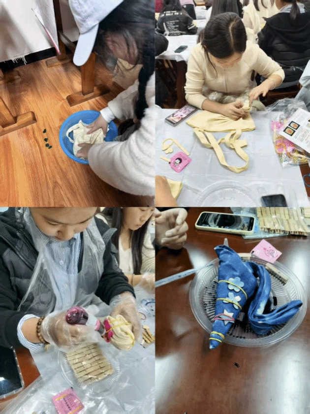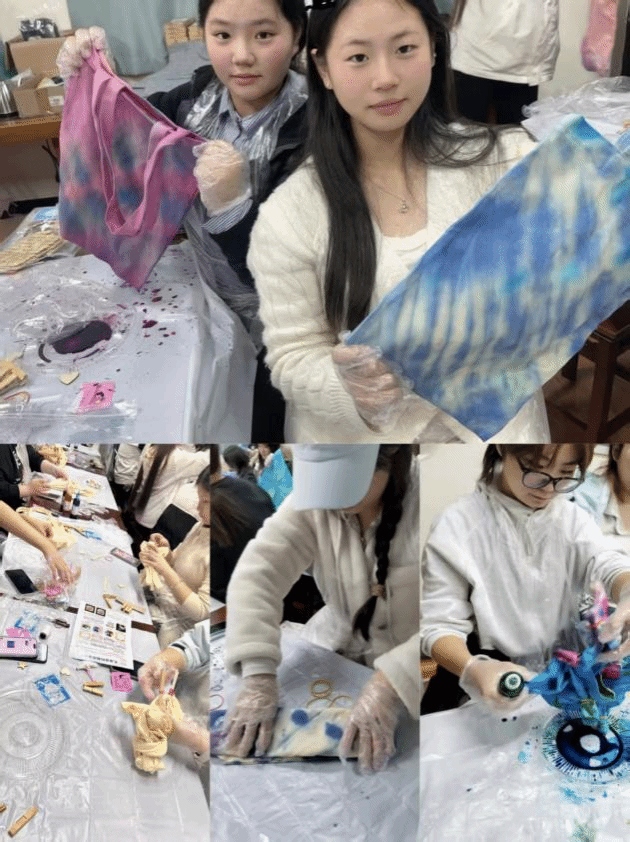 在简单地介绍后,同学们纷纷动手体验。从布局构思、折叠捆扎,到精心挑选颜色、细致浸染清洗,每个人都全情投入。靛蓝、茜红、秋黄……每一种颜色的选择,都是内心情感的流露;每一处纹路的诞生,皆是创意与偶然的美妙邂逅。