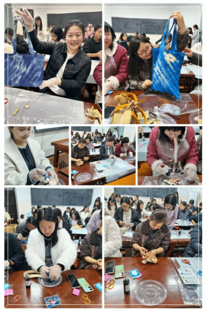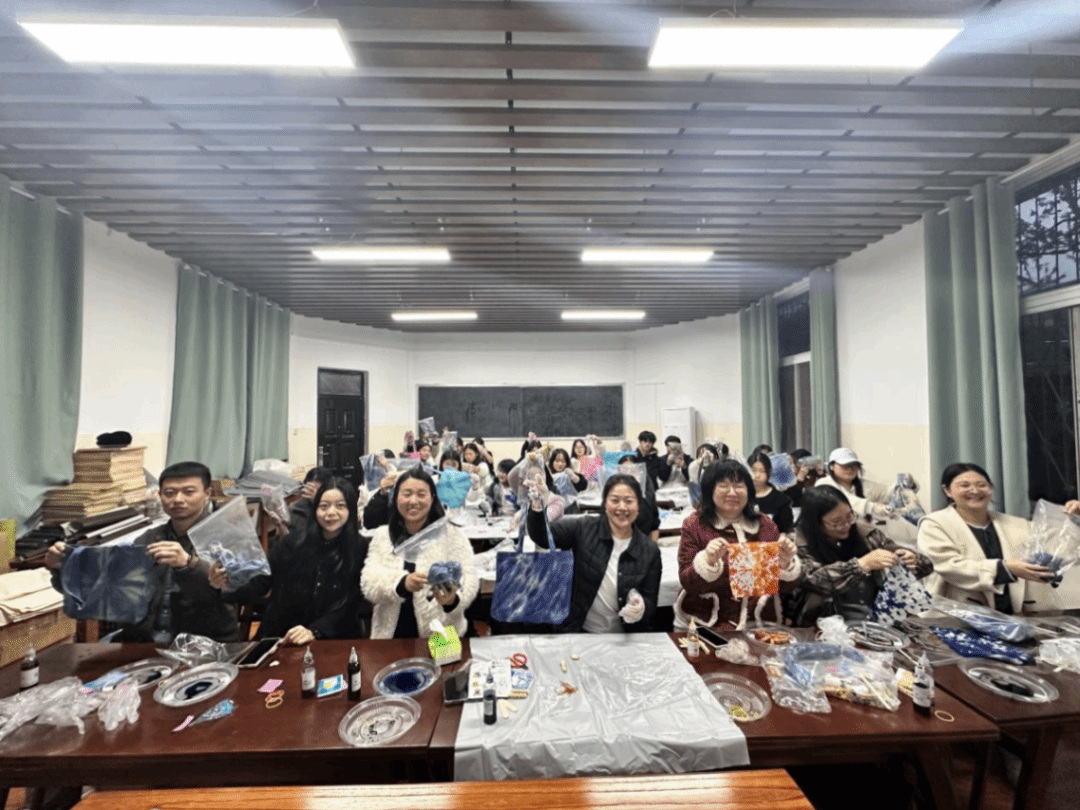 活动现场气氛温馨而专注,随着一块块白布在手中绽放出独一无二的图案,惊叹声与欢笑声此起彼伏。老师们亦被这份专注与美好所打动,纷纷投身扎染制作,与同学们一同感受传统魅力,抒发内心情感。