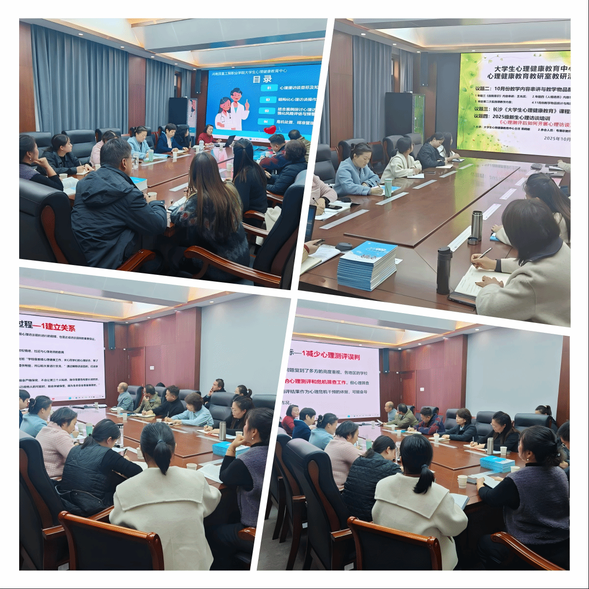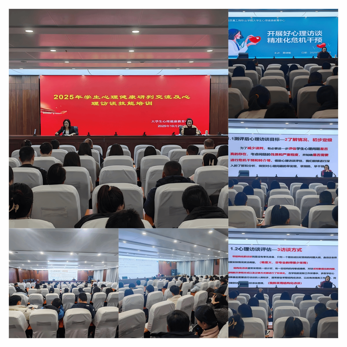 1023日,易晓敏主任以《心理测评后如何开展心理访谈》为题,和二级院部党总支(支部)书记、副书记、心理专员,专兼职心理咨询师进行交流,强化风险评估能力;1029日,举办《开展好心理访谈,精准化危机干预》专题培训,覆盖辅导员、宿管老师等关键岗位,完善危机处置闭环机制,筑牢校园心理安全防线。