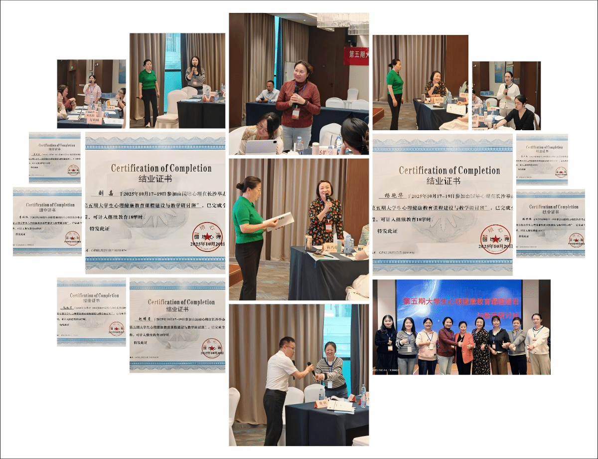 1017日至20日,选派8名教师参与“第五期大学生心理健康教育课程建设与教学研讨班”,先后聆听段鑫星教授关于课程本质解读、金课建设等四大核心内容,以及廖传景教授关于课程设计、教学实施和科研方向的专题培训。1023日,通过教研会议交流培训心得,为《大学生心理健康教育》课程优化注入新思路。