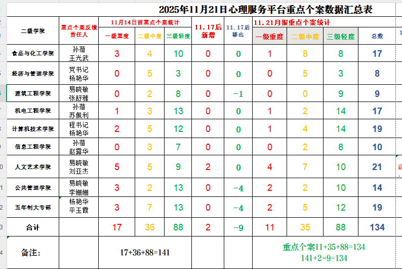 930日至1014日,面向255982名新生开展心理健康测评1025日至1115日,针对筛查出的403名高危预警学生、1187名重点关注学生和913名潜在风险学生开展访谈与日常关注通过二次筛查访谈,新增66名重点关注学生,构建了全链条、差异化的心理干预体系。