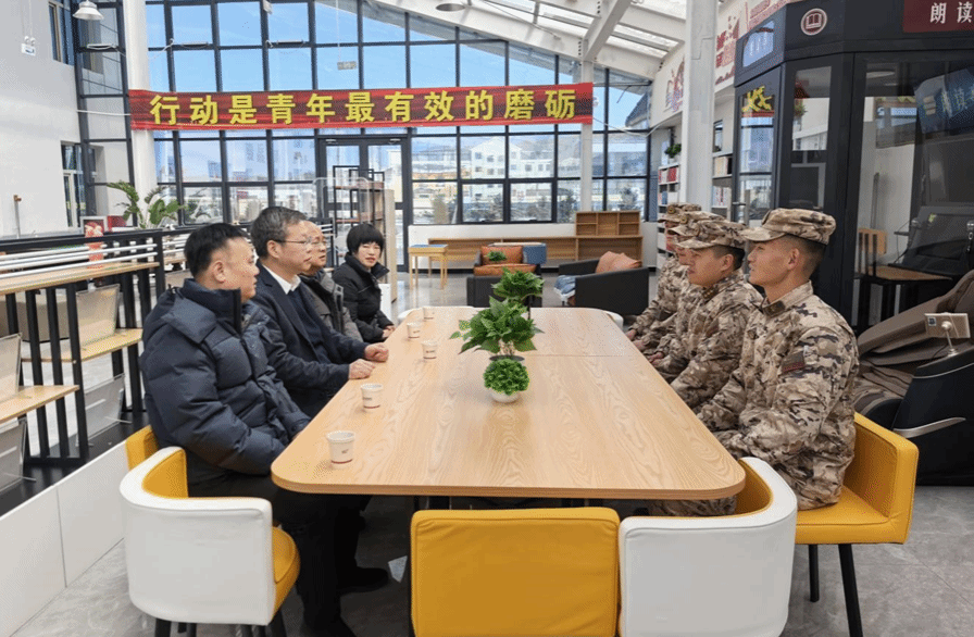 在甘德中队,鲁书喜一行向部队官兵表达亲切问候,并送上慰问品。部队领导代表中队向学校来访同志赠送哈达,以示欢迎和感谢。座谈交流中,学校领导与中队负责同志就大学生士兵培养、军校协同育人等话题进行了深入沟通,详细了解了我校入伍学子在军营中的思想表现、纪律表现、训练和学习情况。鲁书喜对中队在培养教育我校入伍学子方面的支持表示感谢,并勉励学子安心服役,严格要求自己,在部队锤炼过硬本领,为学校争光、为强军事业贡献力量。部队领导对我校高度重视征兵工作、持续关心入伍学生成长表示高度评价。他指出,高校为部队输送了一批综合素质高、专业基础扎实的大学生,不仅为学生个人成长成才搭建了舞台,也为部队注入了新鲜血液,有力推动了国防和军队现代化建设。