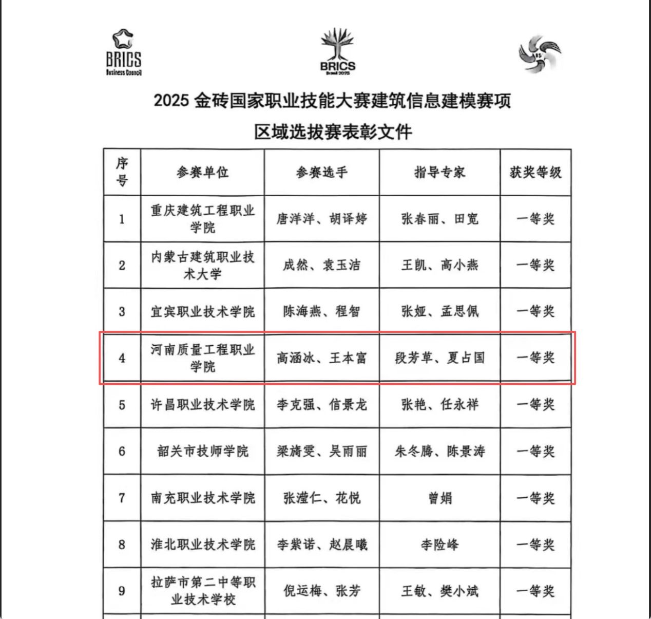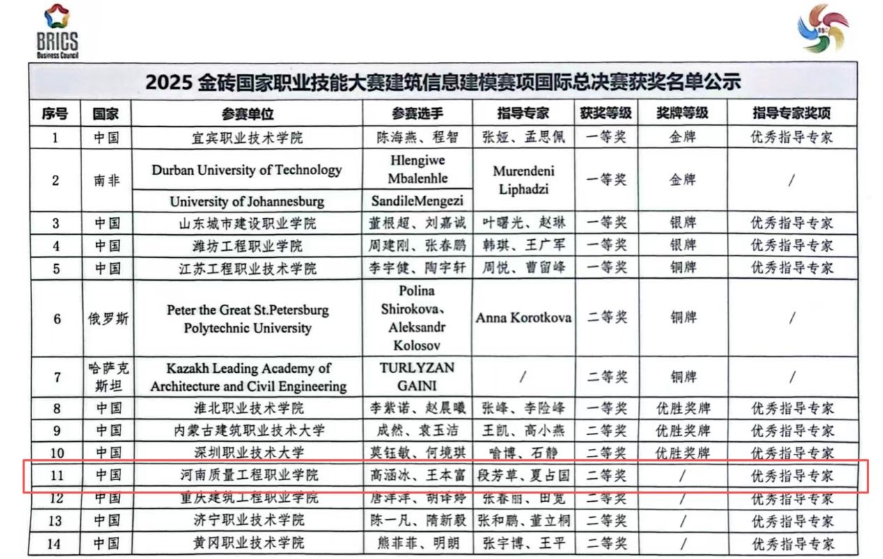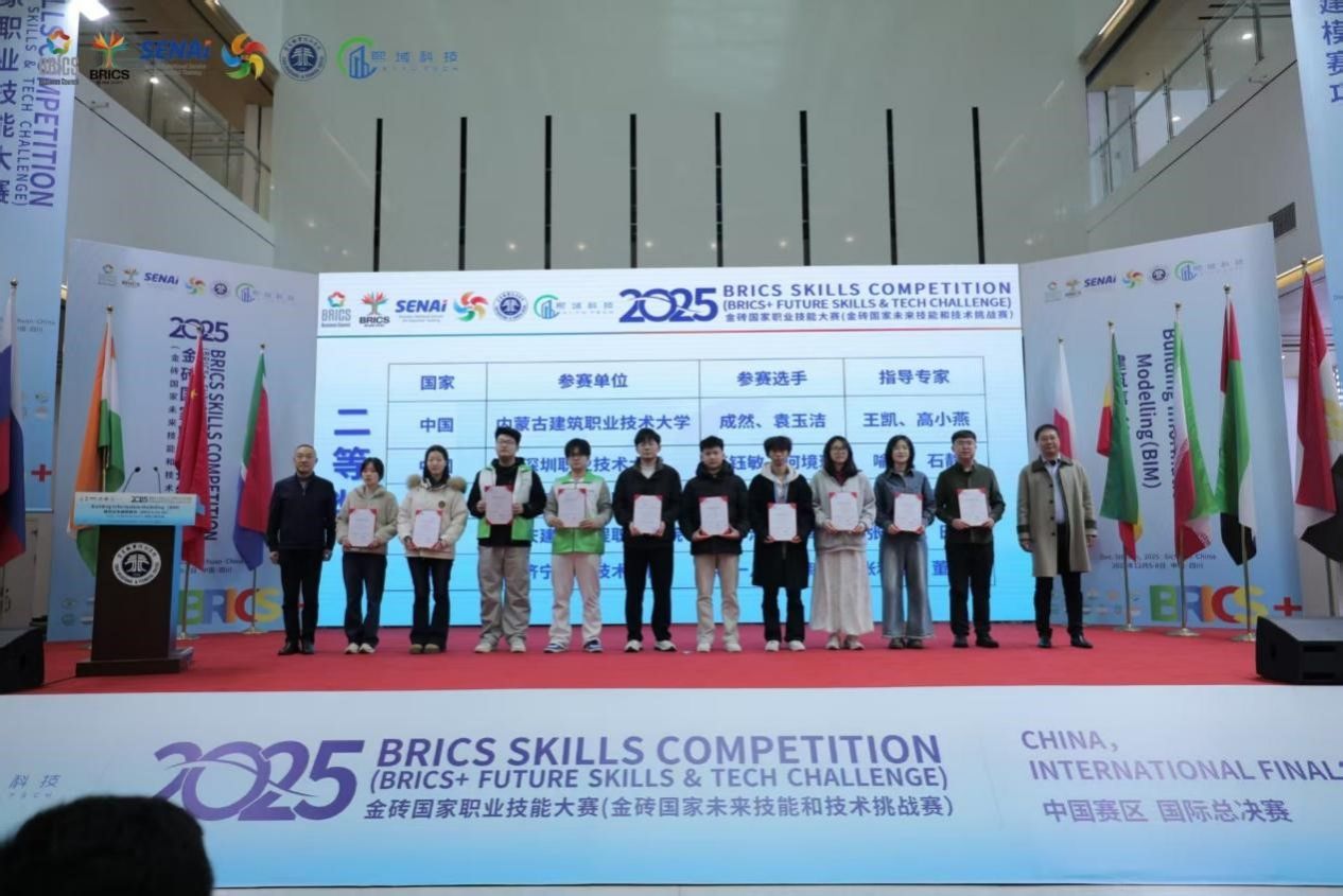 近日,2025 金砖国家职业技能大赛(金砖国家未来技能和技术挑战赛)建筑信息建模赛项国际总决赛在宜宾职业技术学院落幕。我校建筑工程学院高涵冰、王本富同学组成的代表队,在国内 17 个省市 42 支代表队及 5 个国家 11 支国际队伍(共 53 支队伍)的角逐中脱颖而出,斩获二等奖,创下我校在该项国际赛事的历史最佳成绩。