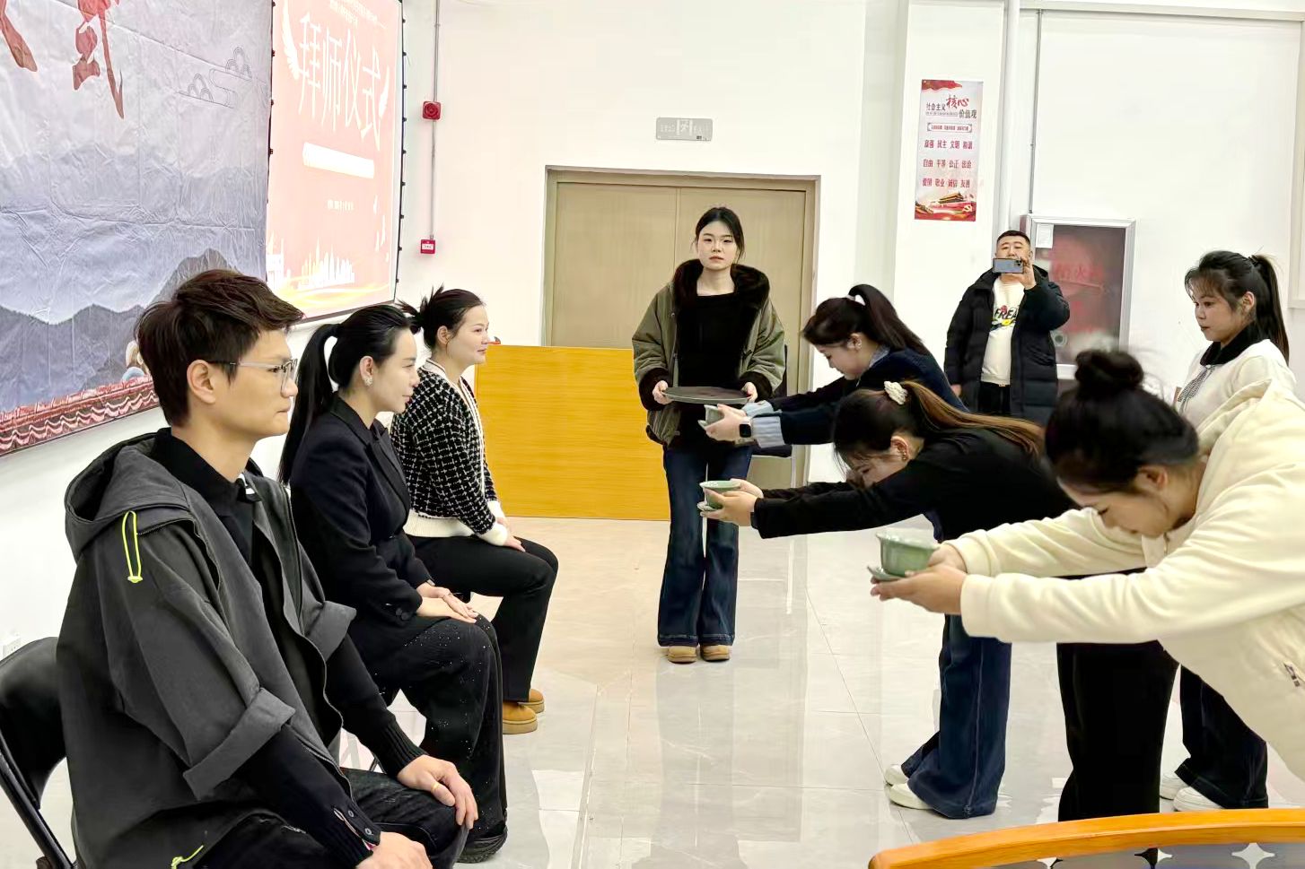 作为仪式的核心环节,拜师礼严格遵循传统礼仪规范。徒弟代表整齐肃立,向端坐台前的行业导师行三鞠躬礼——一拜勤栽培,二拜传技艺,三拜承师恩。随后,学员们依次上前向导师敬茶,一声真挚的“师傅”,一杯暖心的清茶,正式缔结了师徒情谊,也承载起技艺传承、匠心延续的使命与期许。