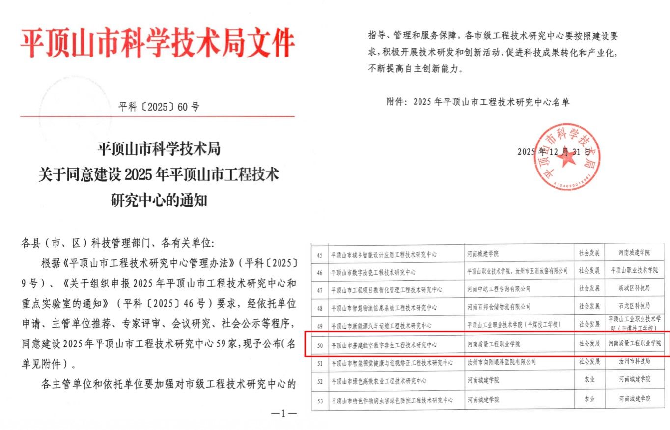 近日,由平顶山市科学技术局获悉,我校建筑工程学院申报的平顶山市基建低空数字孪生工程技术研究中心成功获批。该中心是平顶山市首家聚焦低空领域的市级工程技术研究中心,其成功获批,标志着我校在低空数字孪生领域的科研平台建设跻身全市领先行列,为后续开展关键技术攻关、科技成果转化及社会服务工作,奠定了坚实的权威平台基础。