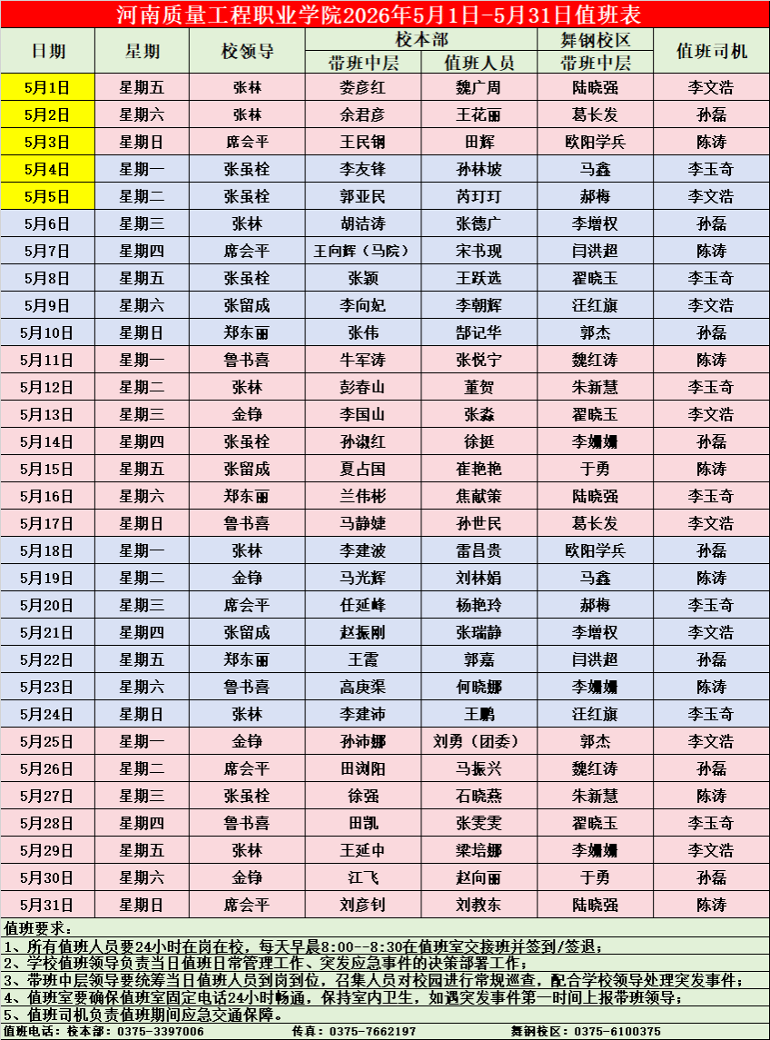学校2026年5月份值班表