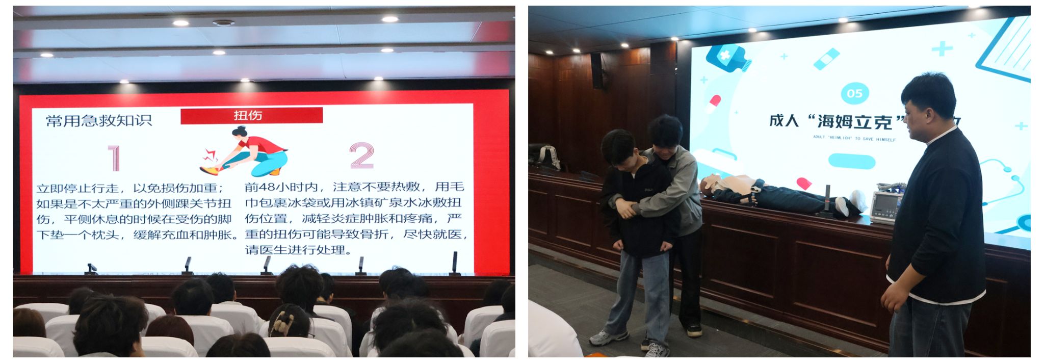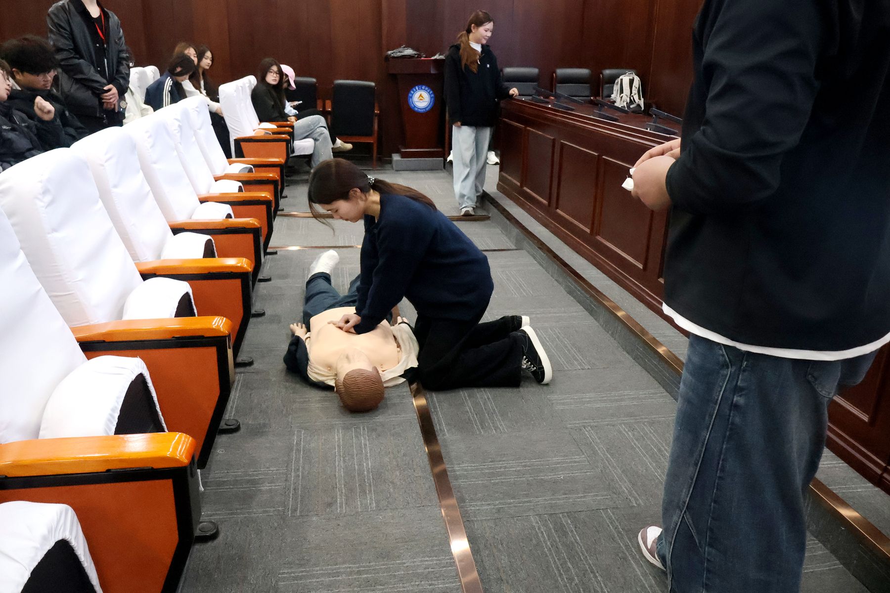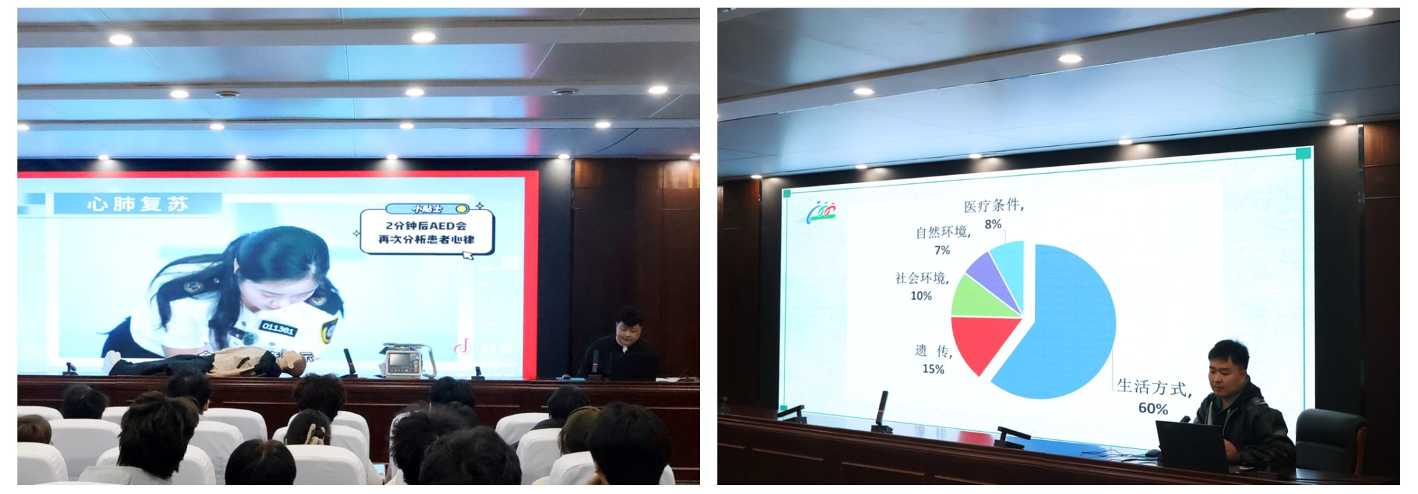 讲座后,设置了互动问答与实践操作环节。学生代表在医务人员指导下进行了心肺复苏模拟操作。现场互动积极,气氛热烈。