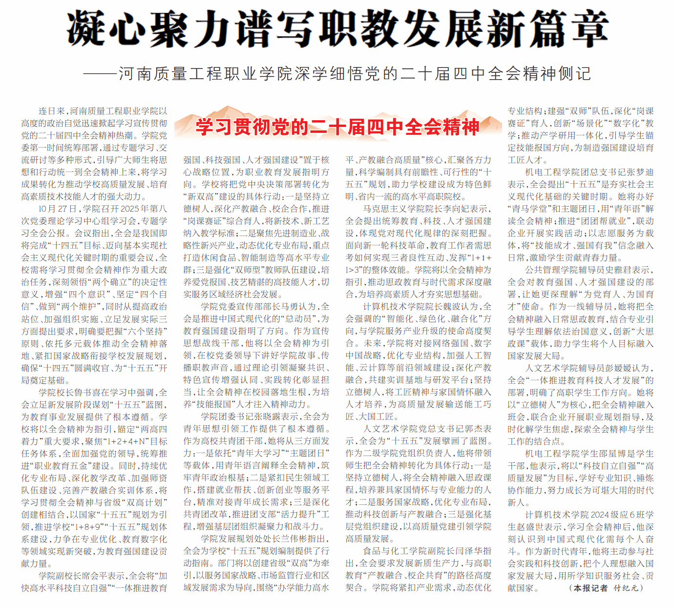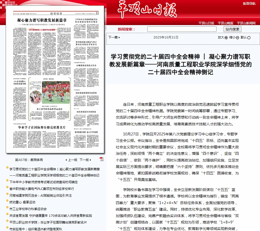 平顶山日报:凝心聚力谱写职教发展新篇章——河南质量工程职业学院深学细悟党的二十届四中全会精神侧记