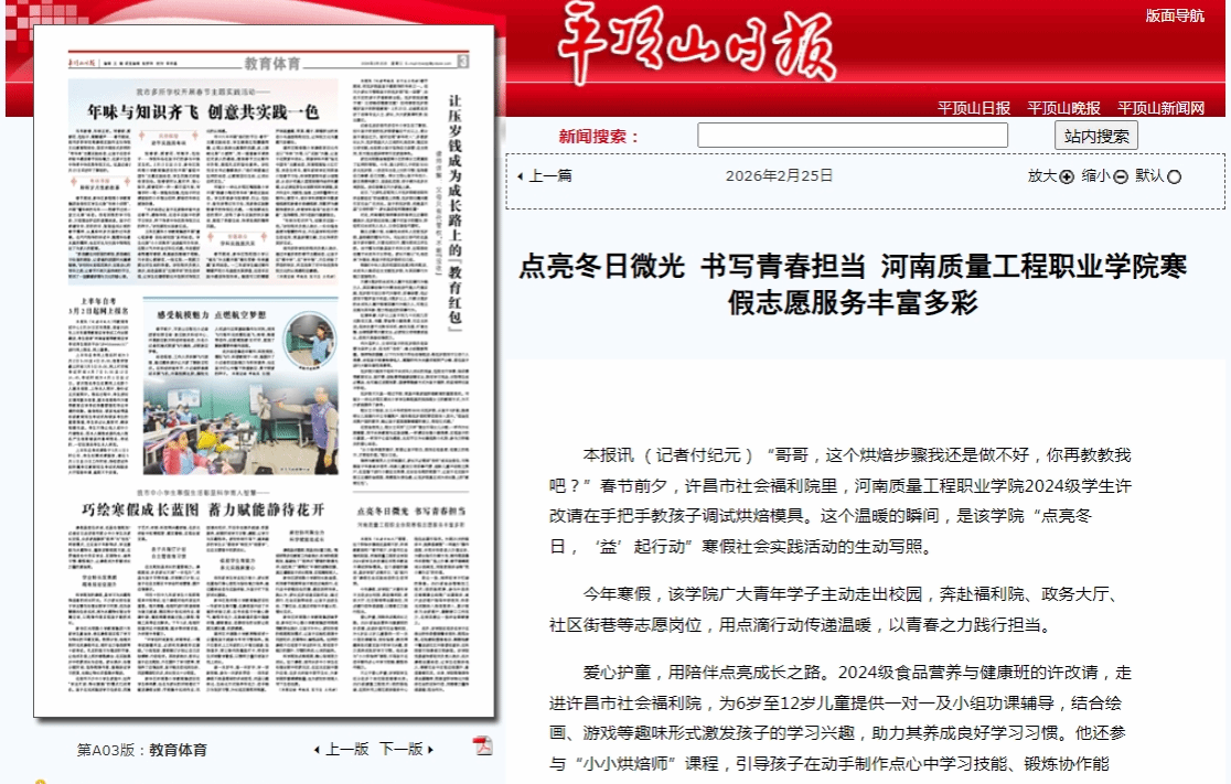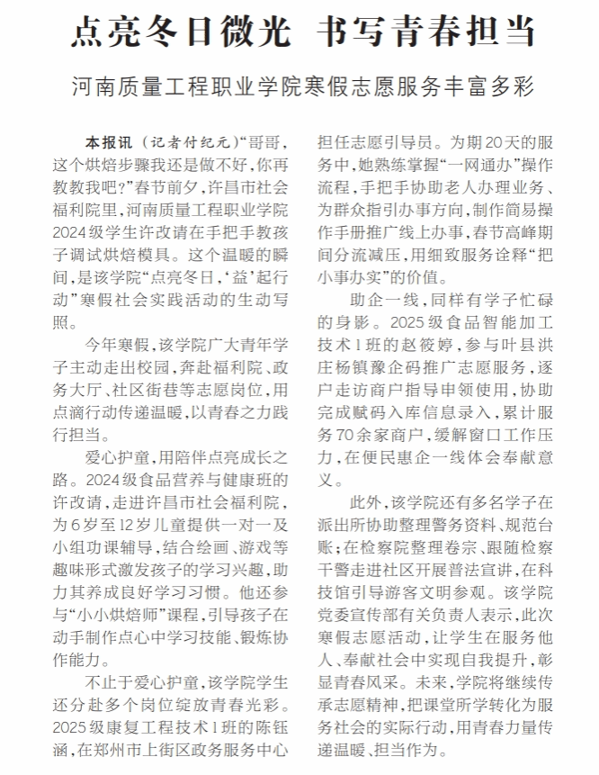 平顶山日报:点亮冬日微光 书写青春担当——河南质量工程职业学院寒假志愿服务丰富多彩