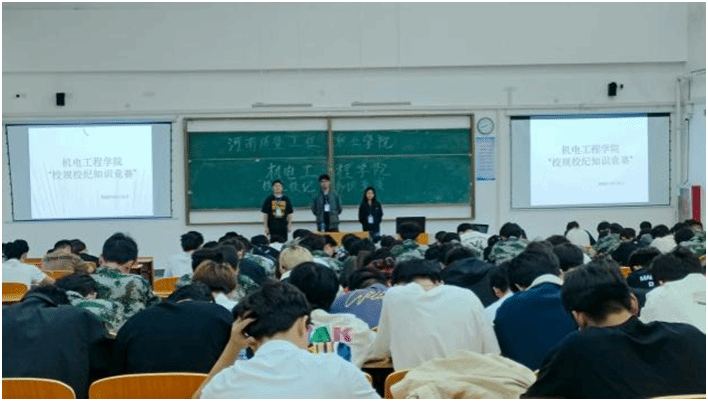 为帮助学生深化校纪校规认知,推动规则意识内化于心、外化于行,9月12日中午13点10分,机电工程学院在舞钢校区致知楼10101教室举办校纪知识竞赛,24级、25级学生积极参与。