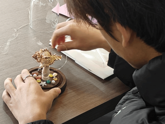 本次活动以海螺小夜灯制作为载体。活动现场,洁白的海螺、暖黄的灯串、晶莹的胶水、精致的饰品与底座整齐陈列,仿佛将海滨的宁静微缩于方寸之间。在老师的引导下,同学们首先仔细端详手中海螺的天然纹理,随后将灯串轻柔地嵌入螺壳之中,让暖光顺着螺旋纹路缓缓流淌。大家还利用贝壳、小珍珠等饰品元素进行创意点缀,在指尖的专注与构思的沉淀中,逐渐进入宁静的心流状态,只余下与自然物语相伴的安然与舒展。