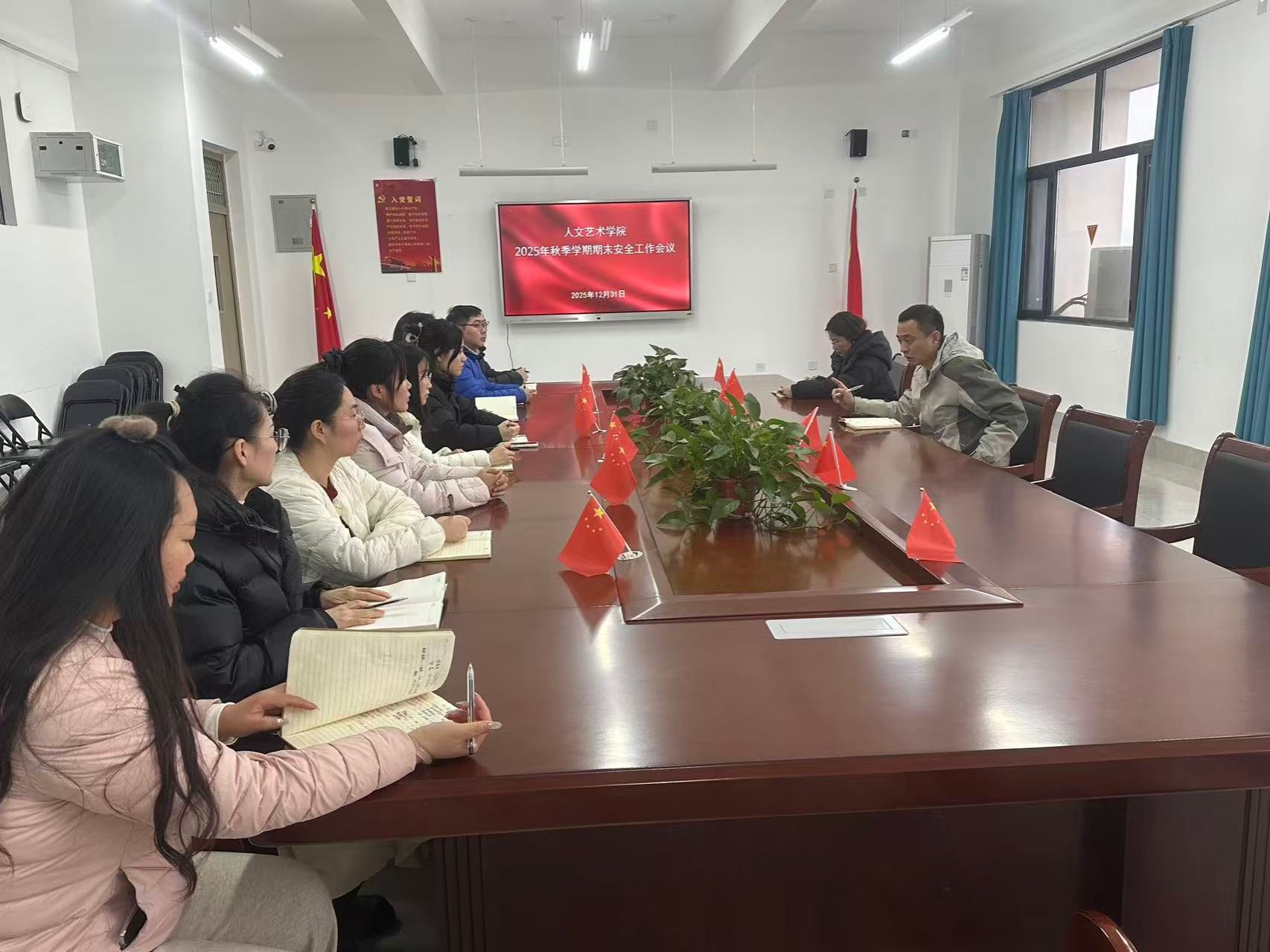 为切实保障期末校园安全稳定,压实安全管理责任,有效防范各类安全风险,12月31日上午,人文艺术学院在知行楼B305召开2025年秋季学期期末安全工作专题会议。学院党总支书记郭杰主持会议并讲话,全体专兼职辅导员参加会议。