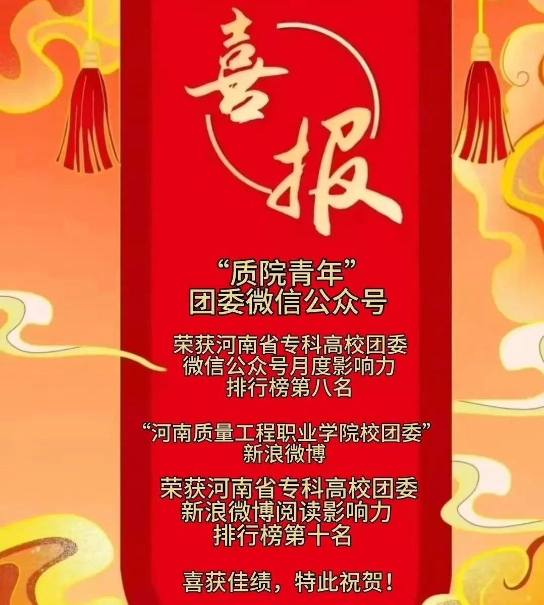 近日,河南省高校团委月度影响力榜单揭晓,我校院团委“质院青年”微信公众号荣获河南省专科高校团委微信公众号月度影响力排行榜第八名,“河南质量工程职业学院团委”新浪微博荣获河南省专科高校团委新浪微博月度影响力排行榜第十名,喜获佳绩,特此祝贺!