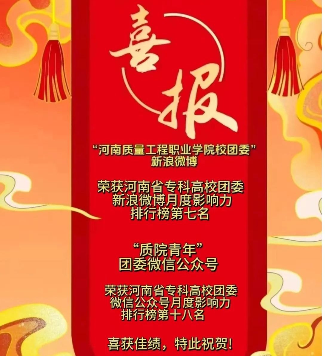 近日,河南省高校团委月度影响力榜单揭晓,“河南质量工程职业学院团委”新浪微博荣获河南省专科高校团委新浪微博月度影响力排行榜第七名,我院“质院青年”团委微信公众号荣获河南省专科高校团委微信公众号月度影响力排行榜第十八名,喜获佳绩,特此祝贺!