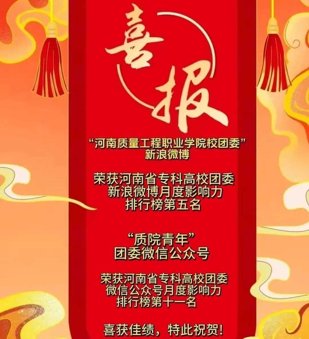 近日,河南省高校团委月度影响力榜单揭晓,“河南质量工程职业学院团委”新浪微博荣获河南省专科高校团委新浪微博月度影响力排行榜第五名,我院“质院青年”团委微信公众号荣获河南省专科高校团委微信公众号月度影响力排行榜第十一名,喜获佳绩,特此祝贺!