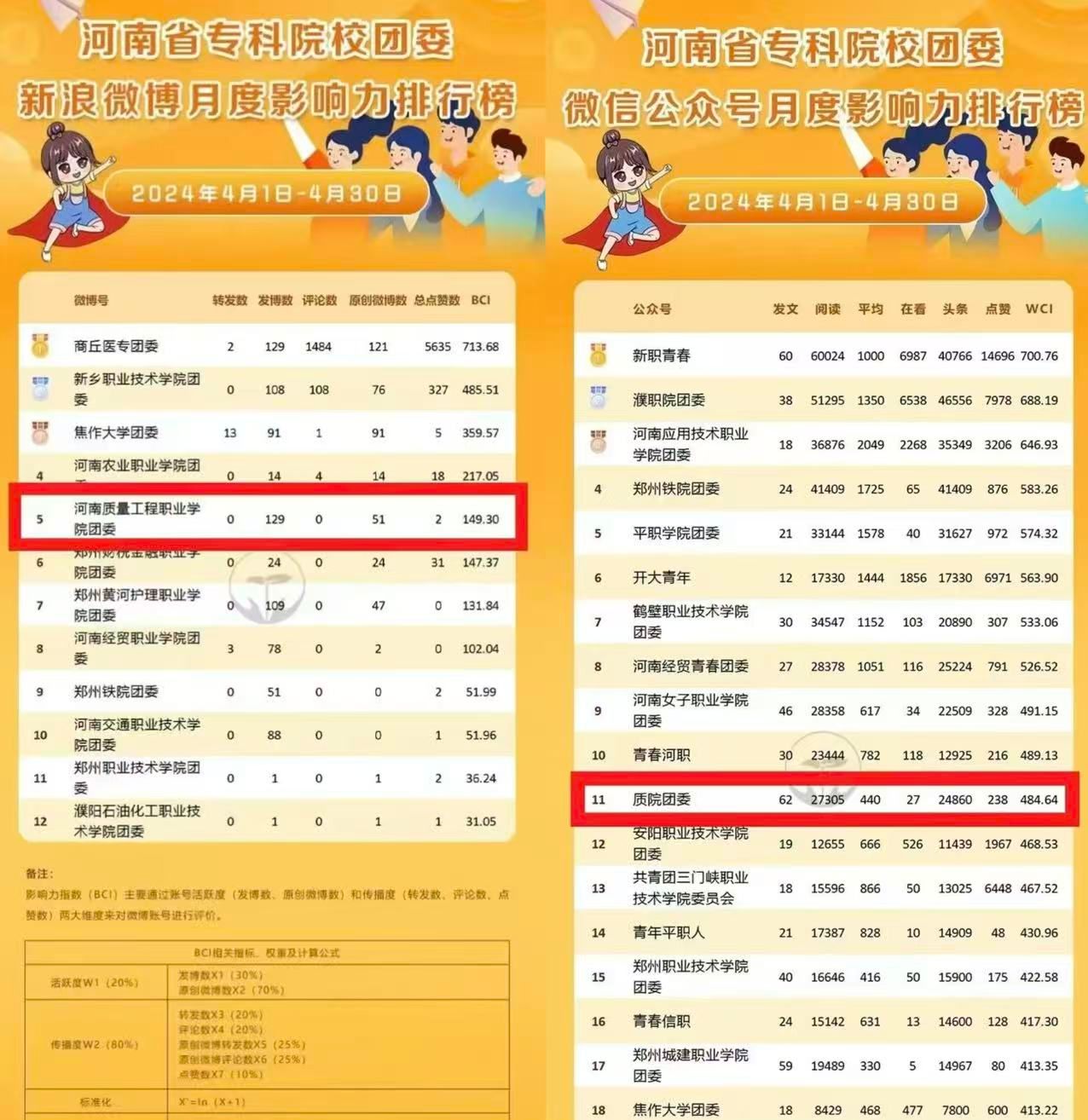 近日,河南省高校团委月度影响力榜单揭晓,“河南质量工程职业学院团委”新浪微博荣获河南省专科高校团委新浪微博月度影响力排行榜第八名,我院“质院青年”团委微信公众号荣获河南省专科高校团委微信公众号月度影响力排行榜第11名,喜获佳绩,特此祝贺!