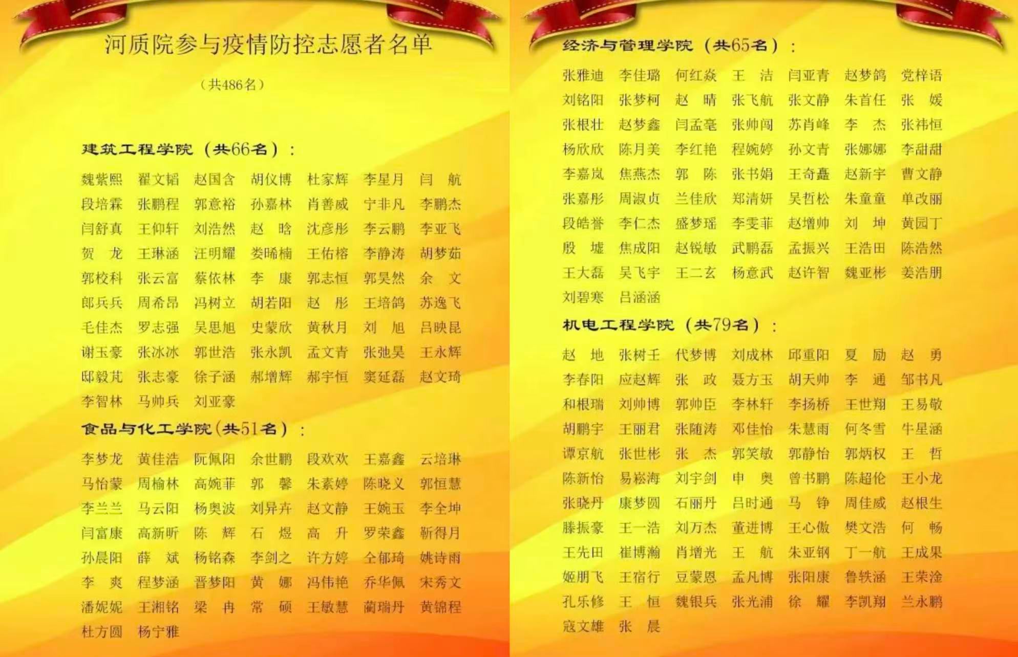 为深入学习贯彻习近平总书记关于青年工作的重要思想,落实省委关于疫情防控工作部署要求,我院积极开展返乡大学生团员向社区(村)报到活动,组织动员广大返乡大学生团员落实以城市社区和行政村防控为主的综合防控措施,加入本地区大学生团员志愿者队伍,积极参与到城乡基层重点工作,充分发挥共青团生力军作用。截止目前,全院共有486名志愿者参与疫情防控,现将名单公示如下: