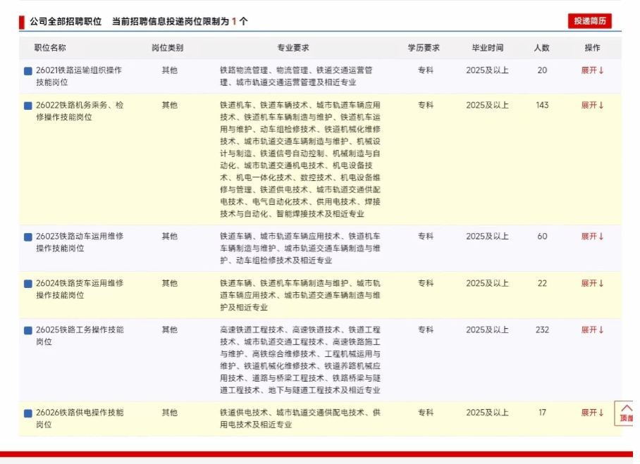 (二)符合招聘岗位要求的专业条件,列入国家招生计划,2026年、2025年毕业的未与其他任何单位签订就业协议或劳动合同的全日制普通高校大专(高职)毕业生。在校期间所学专业为铁路方向或所学主要课程中包含铁路专业课程。